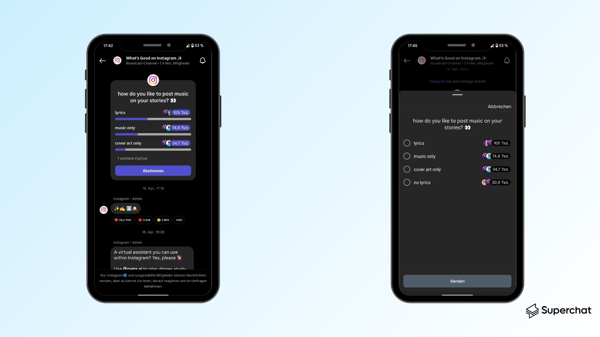 Channels, whether on Instagram, WhatsApp or Telegram, are not designed for interaction, but are mainly linear channels. On Instagram, followers can react to posts in the channel (quick reactions) or take part in polls, but they cannot comment on posts. This distinguishes broadcast channels from other content formats on Instagram.