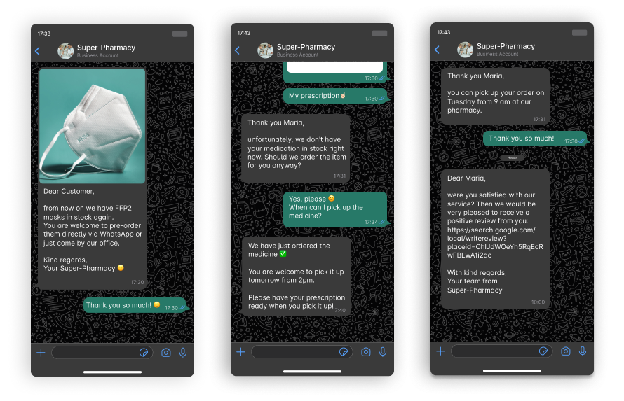 Since October 25, 2022, almost all business functions of the WhatsApp Messenger are available to pharmacies.